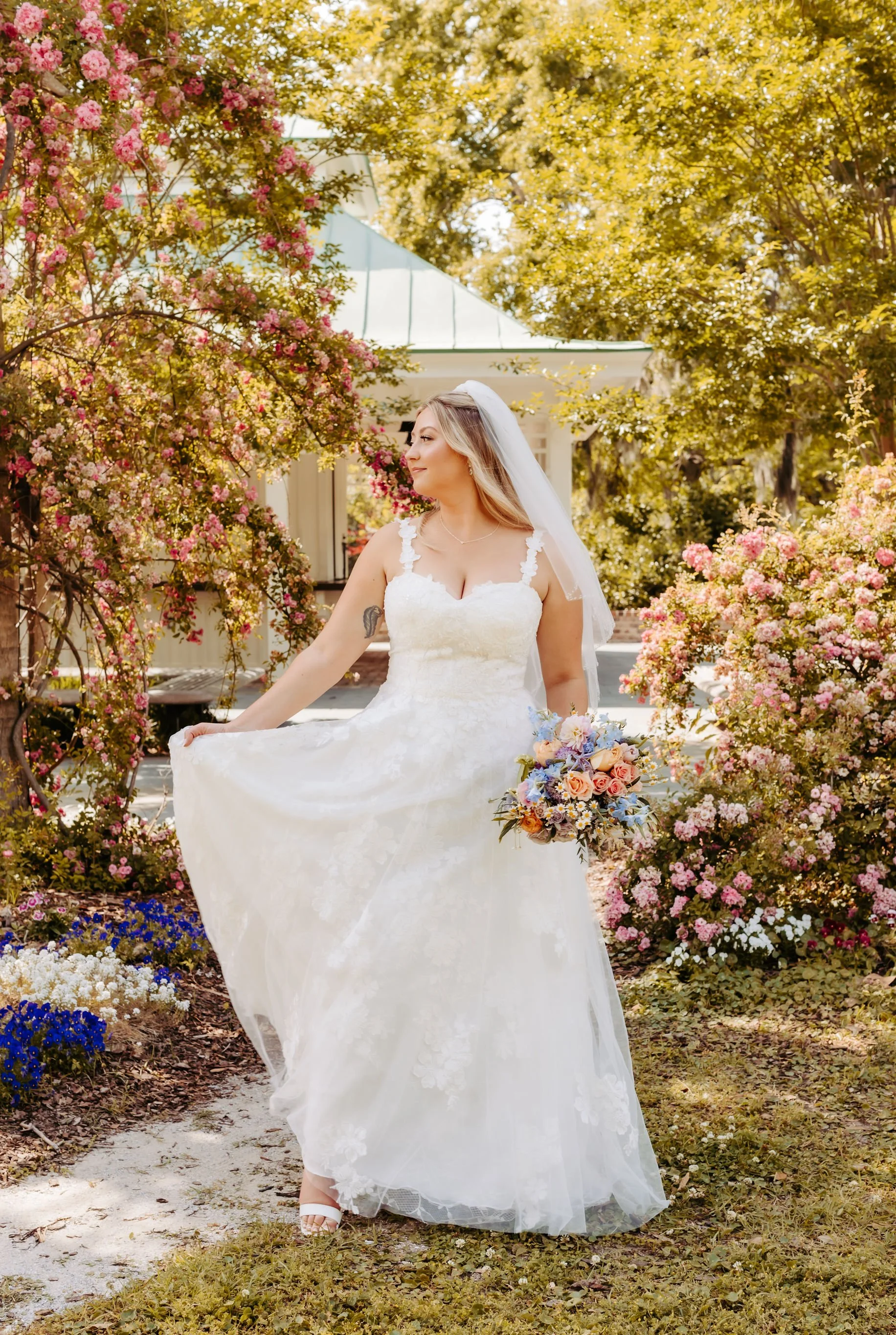 If you're looking for a spot with lush greenery and a peaceful ambiance, Hampton Park is an excellent choice. This park features a large white gazebo that offers shelter from unexpected rain, making it a charming and practical location for your elopement photos. Similarly, White Point Garden offers a beautiful setting along the Battery with sweeping oak trees and historical houses nearby, and it also has a gazebo that can be used in case of rain. This location provides a quintessential Charleston look and is perfect for a romantic elopement.